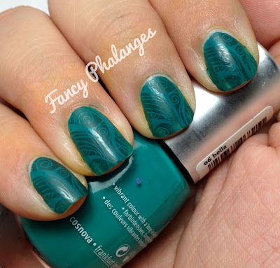 I started with one coat of a Forever 21 matte teal polish. Then I stamped with Kiss plate B65 and Essence Bella. I thought Bella was going to be glossier and contrast more. Despite that, I really like the design. There's a bare spot on my index nails because I dropped my clean-up brush on it haha.